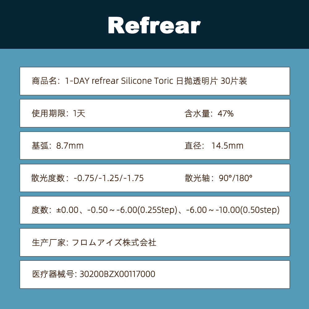 1-DAY refrear SILICONE TORIC ワンデーリフレア シリコーン 乱視用 UV Wモイスチャー-30枚入-DIA14.5mm | BC8.7mm | 含水率47%
